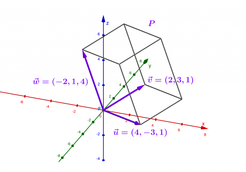 Le déterminant de trois vecteurs $u,v,w$ de l’espace euclidien est aussi appelé produit mixte de ces trois vecteurs, et peut être défini à partir d’une généralisation spatiale de la caractérisation du déterminant de deux vecteurs du plan comme aire algébrique du parallélogramme qu’ils déterminent (voir L’interprétation géométrique plane du déterminant). Ainsi, plutôt que d’introduire une définition dépourvue de sens ou de justification, nous allons nous appuyer sur cette interprétation géométrique du déterminant dans le plan, pour en induire sa définition analytique dans l’espace. La généralisation d’un parallélogramme à l’espace étant un parallélépipède, ceci signifie que nous devons donc définir le déterminant $det(u,v,w)$ comme le « volume algébrique » du parallélépipède (implicitement orienté !) que ces trois vecteurs déterminent dans cet ordre.